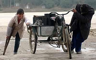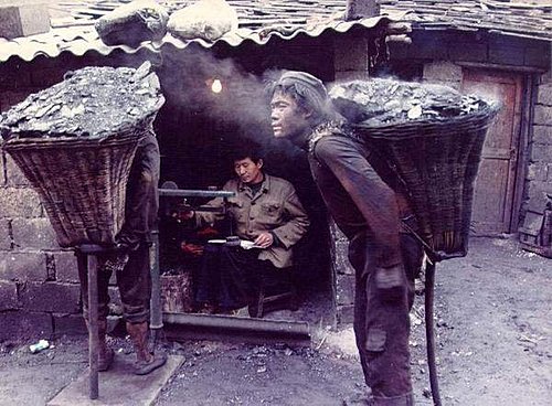 一筐煤40公斤 ,從煤坑向上爬100米,然後再走 1000米山路,掙1元人民幣。